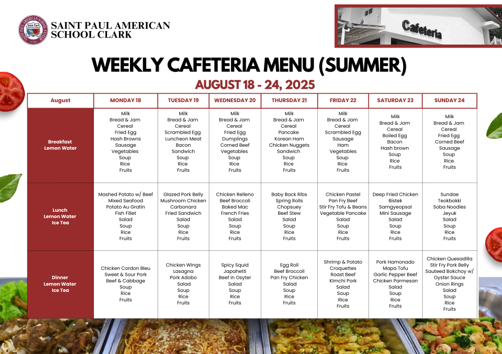 Summer Weekly Cafeteria Menu August 18 - 24, 2025