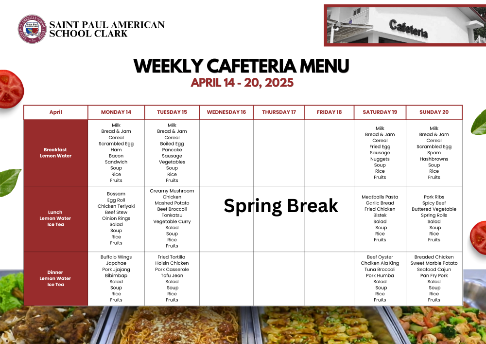 Weekly Cafeteria Menu April 14 - 20, 2025