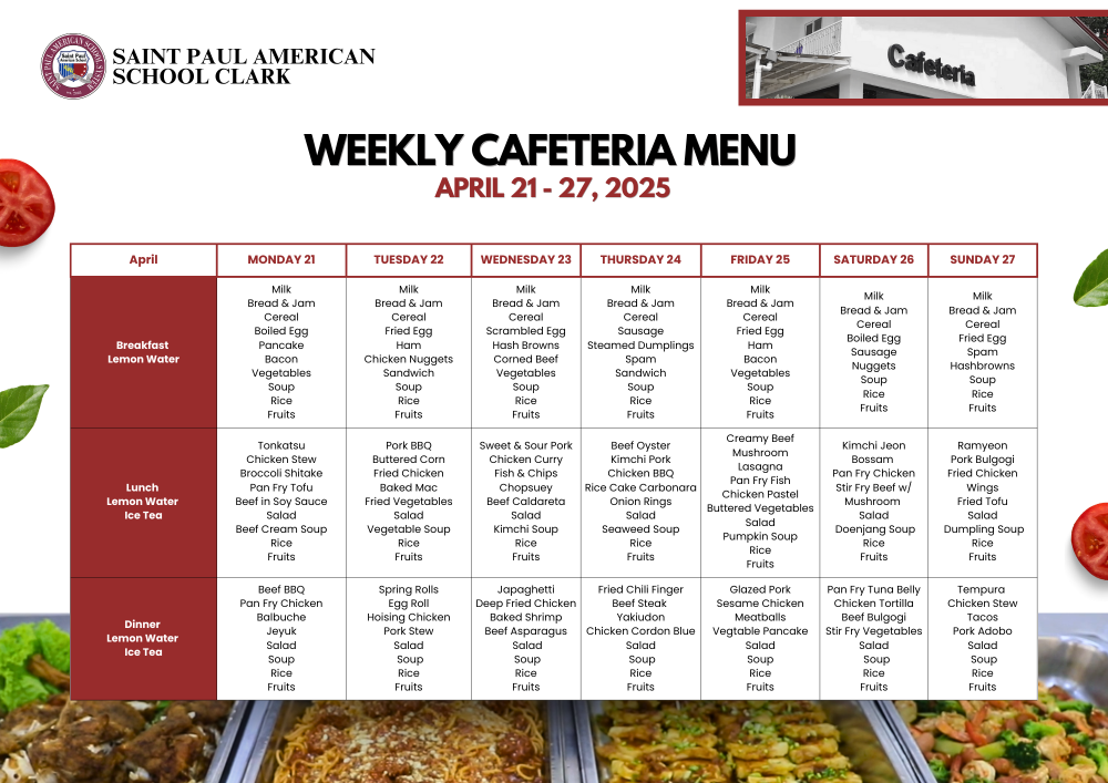 Weekly Cafeteria Menu April 21 - 27, 2025