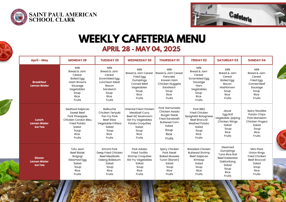 Weekly Cafeteria Menu April 28 - May 4, 2025
