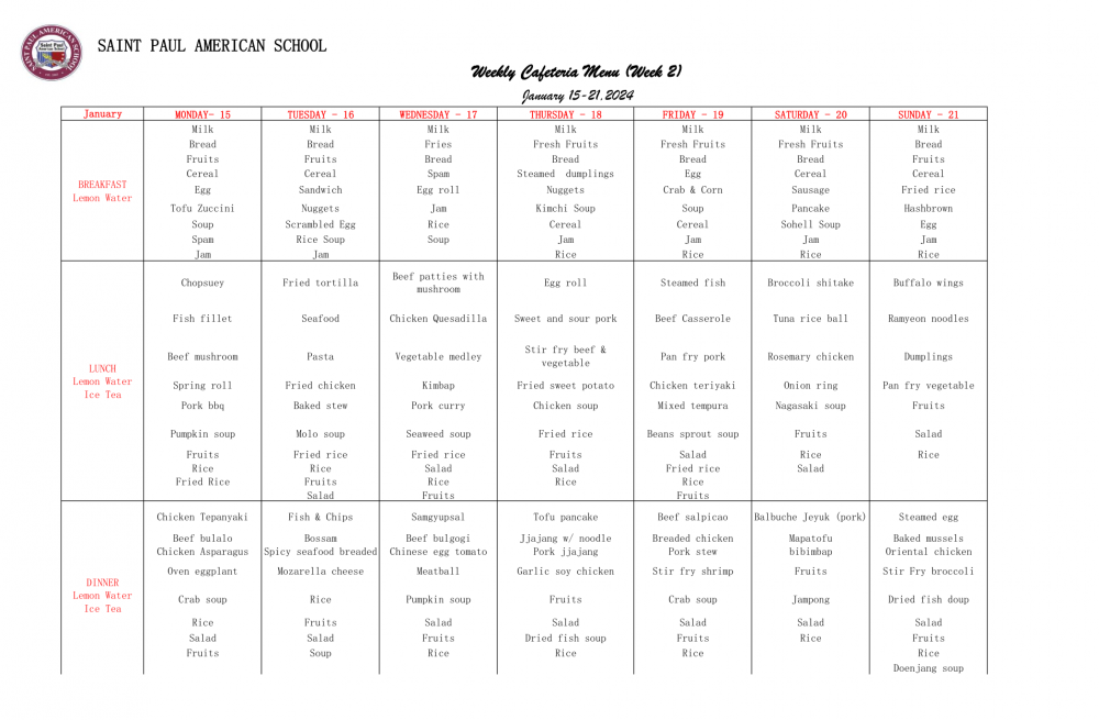 Cafeteria weekly menu 2 January 페이지 정보 By SPAS Date24-01-08 18:50 Hit23,595 Link Previous Next List 본문 Cafeteria weekly menu 2 January 댓글목록 등록된 댓글이 없습니다. Previous Next List