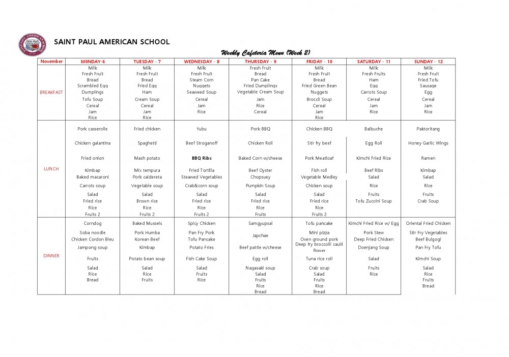 November 06 - 12 Weekly Menu 페이지 정보 By SPAS Date23-11-06 11:55 Hit24,128 Link Previous Next List 본문 Cafeteria Menu 댓글목록 등록된 댓글이 없습니다. Previous Next List