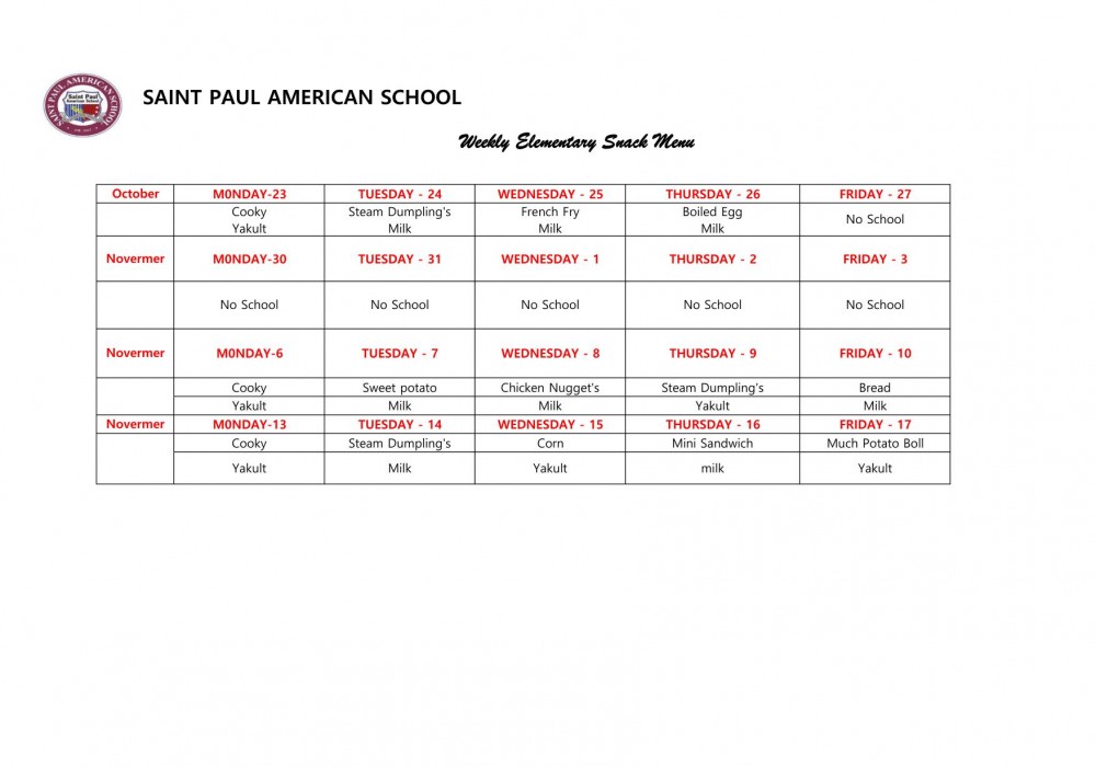 [Elementary Snack Menu] November 6 - November 17 페이지 정보 By SPAS Date23-11-06 11:58 Hit24,085 Link Previous Next List 본문 Elementary Snack Menu 댓글목록 등록된 댓글이 없습니다. Previous Next List