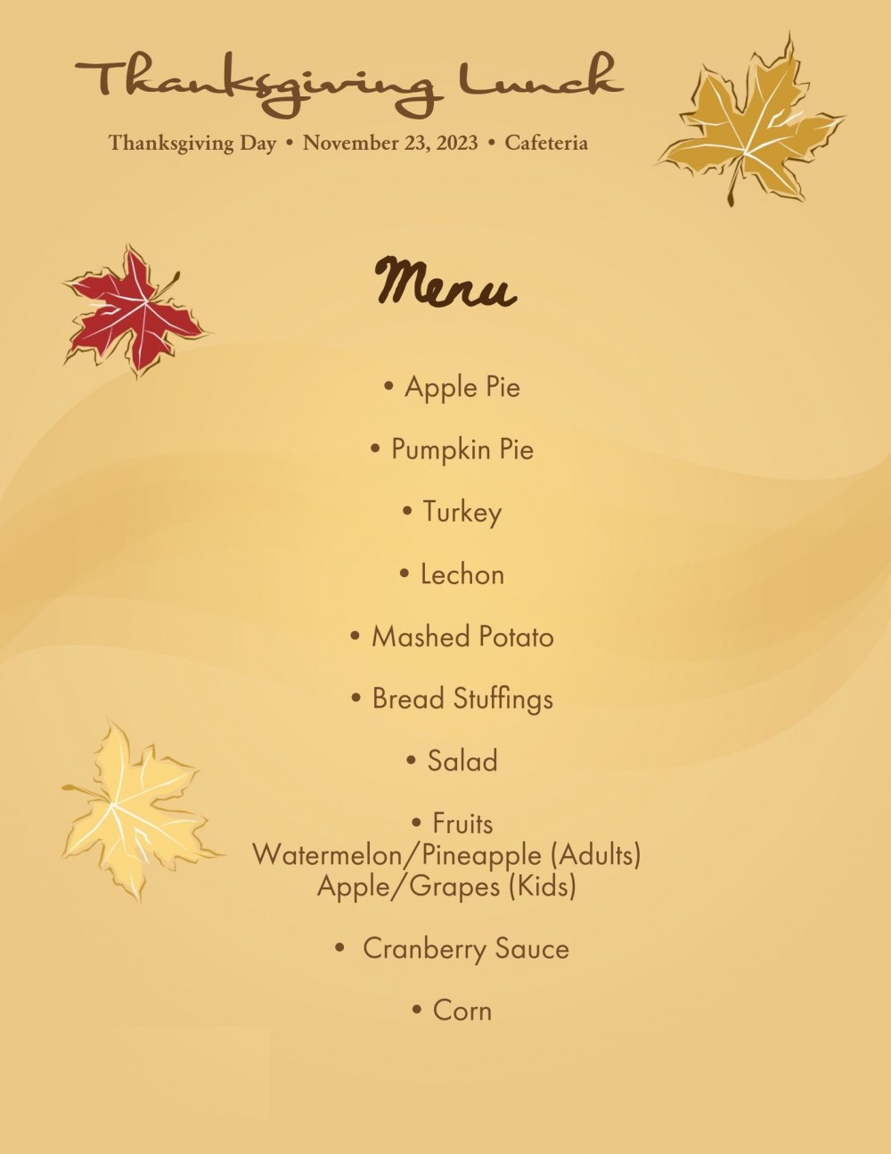 Thanksgiving menu Nov 23. 2023 페이지 정보 By SPAS Date23-11-13 16:38 Hit23,340 Link Previous Next List 본문 Thanksgiving menu Nov 23. 2023 댓글목록 등록된 댓글이 없습니다. Previous Next List